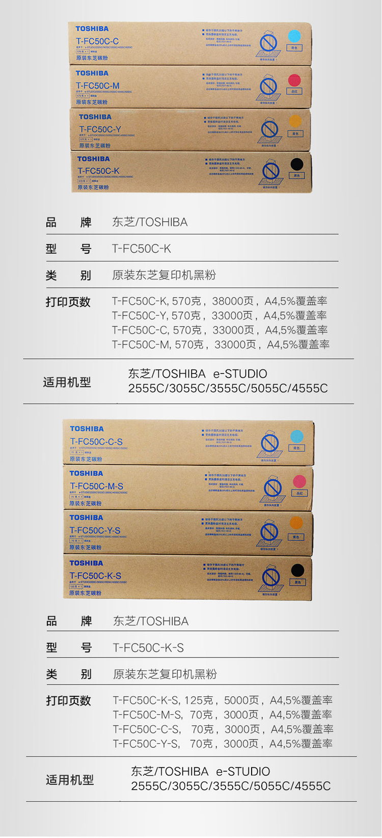 东芝 复印机碳粉盒 T-FC50C-K-S 5000页 小容量 125g 适用于:e-STUDIO2555C/3055C/3555C/4555C/5055C 5000页 黑色