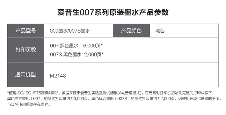 | 商品简介 | 爱普生打印机墨水007s2000页 适用M2148/M2178/M3148黑色 | |